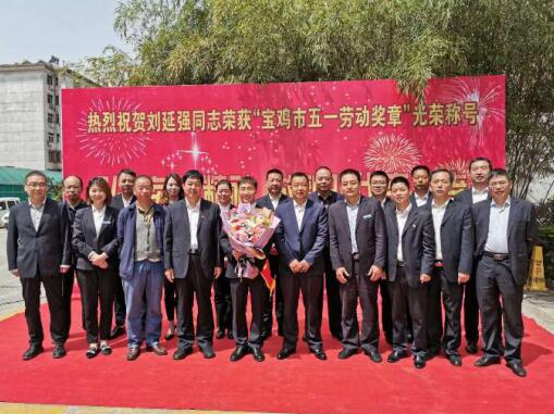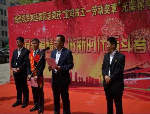 4月30日,宝鸡市劳动者之歌暨庆祝“五一”国际劳动节大会胜利召开,公司刘延强同志被授予“宝鸡市五一劳动奖章”光荣称号,公司在总部办公楼前举行了简朴隆重的欢迎仪式。公司副董事长、总经理胥立,党委书记景旭东,工会主席王建成等出席仪式,总部全体、宝鸡文化艺术中心项目部管理人员参加。